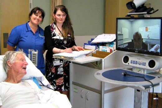 Thames Hospital patient Donald Campbell talks with Waikato Hospital's Dr Ahmad Samad (on screen) via telehealth link as nurse Jo Ghezzi and Dr Eileen McManus assist with the ‘virtual ward round'. Photo: Waikato DHB