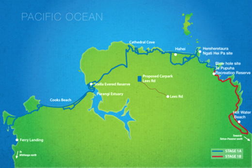 Stage 1A of the Walk from Ferry Landing to the blowhole site south of Hahei, is funded through the district council, DOC, Lotteries Significant Fund and Trust Waikato, while Stage 1B from the blowhole to Hot Water Beach remains unfunded.