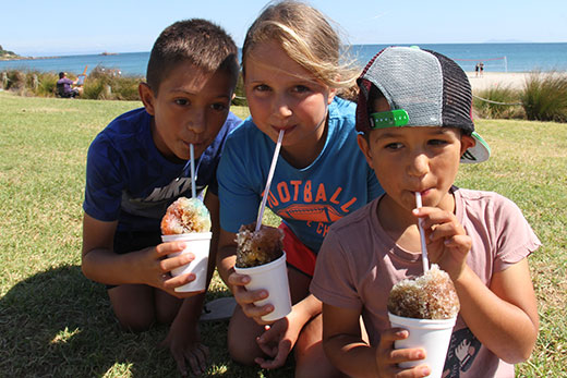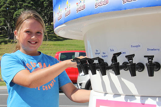 Isabella Gaze, 11, from Auckland putting a topping on her snow cone.