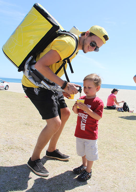 The Lipton's Tea man, Miles Blumsom from Hertfordshire U.K. tops up 2yr old Wyatt Nevis with some iced tea, Wyatt was at the beach with his grand-parents from Belgium.