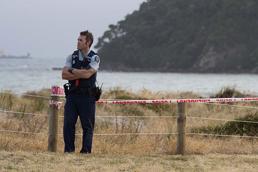 A policeman stands at Mount Main Beach. Photo: Cameron Avery.