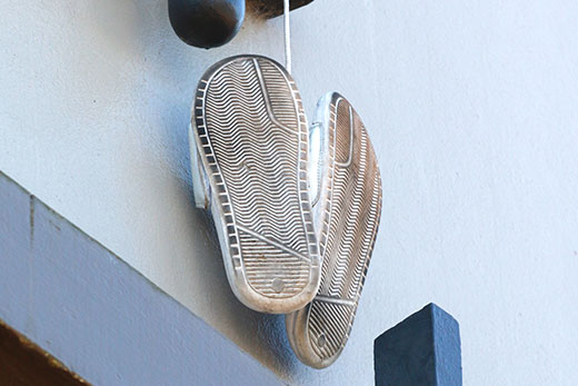 Shoes slung from powerlines generally denote a tinny house in the immediate area.