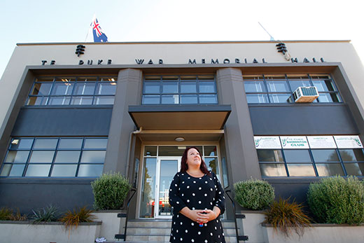 Te Puke War Memorial Hall manager Lydia Wilkinson outside the hall where the flag pole has been damaged. Photos: Bruce Barnard.