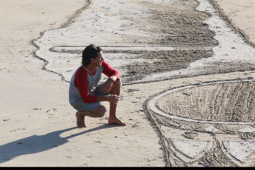 Using one bamboo stick, a bucket, a fishing line and a beach – Jamie has created a three-dimensional stair case, diving board, skateparks and other geometrical shapes in the sand.