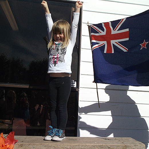 Henry Wilson proudly carrying the New Zealand flag, Boston Brott carrying the Olympic flame. Indie McKenzie, Zara Scholes, Farron Mobberley, Violet Harris, Vanessa (teacher), Lachlan Kerr, Sophie Gernigant, and Elliot Tunney all join in the welcoming ceremony.