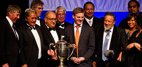 Governor General Sir Anand Satyanand and other dignitaries, including Deputy Prime Minister Bill English and Maori Party leader Dr Pita Sharples present the Ahuwhenua Trophy to the Waipapa 9 Trust.