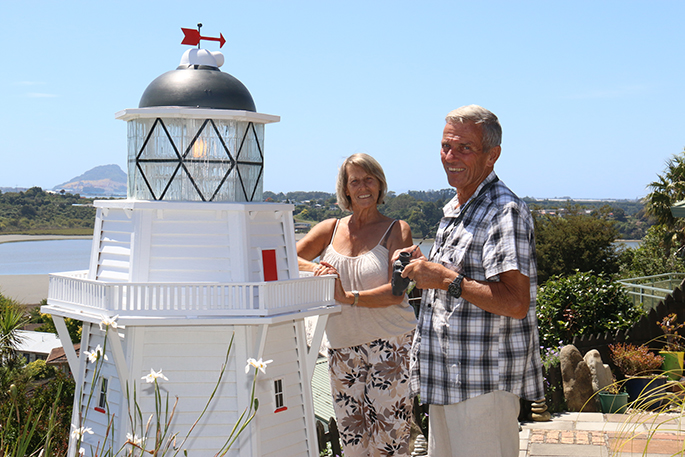 And just as the original Akaroa lighthouse stood high on a bluff at the heads , Mike's roughly 1/10th scale Akaroa lighthouse now stands at his front door, high above Victory St in Welcome Bay with a commanding view of Mauao.