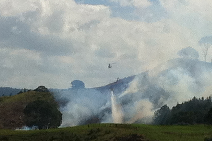 A helicopter with a monsoon bucket has been called to help firefighters quell a scrub fire in Te Puna this afternoon.
