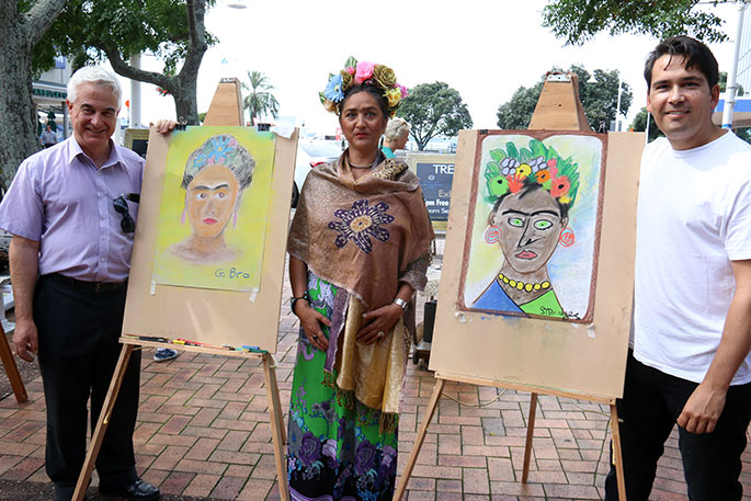 Tauranga Mayor Greg Bownless and Tauranga MP Simon Bridges with their finished portraits of The Incubator model Tanya Trass who dressed up as renowned artists Frieda Kahlo for today's event.