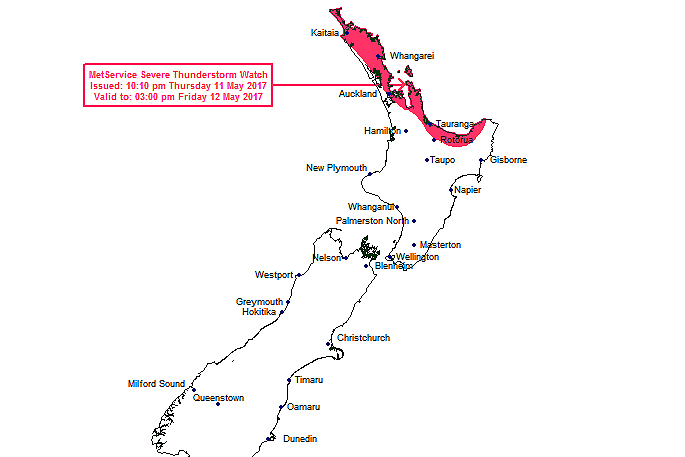A severe weather warning, a severe weather watch and a thunderstorm watch is in place for many places in the North Island.