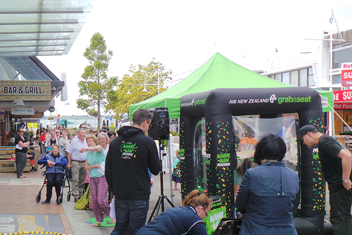 A queue of around 50 people were lined up along Wharf Street when SunLive visited this afternoon. They were waiting to take their chance inside the Whirl-Win machine – a plastic box full of green and gold confetti.