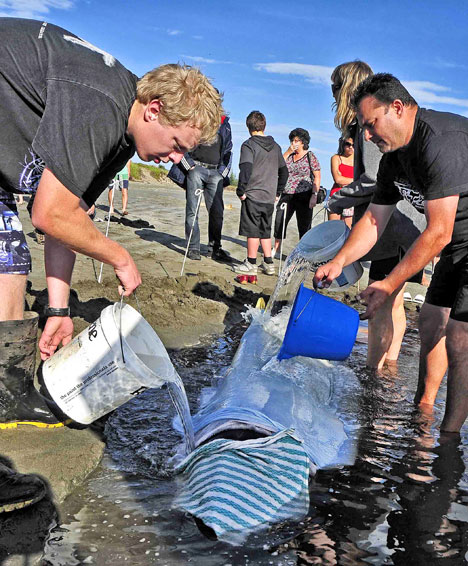 Ohope residents along with tourists and visitors to the area lent a hand and ferried buckets of water to keep the whale rehydrated.