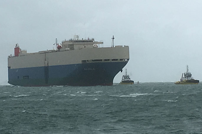 Port in a storm: the vehicle carrier Palmela enters Tauranga escorted by tugs Taitimu and Taipari.
