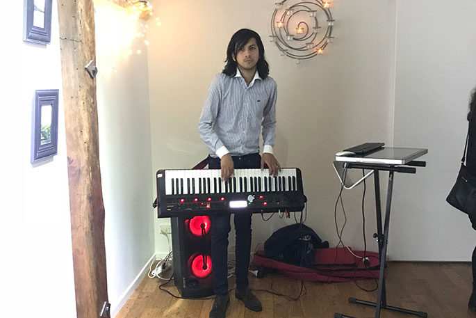 Dieggo Lopez playing music at the exhibition opening on Friday night