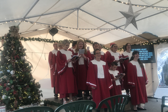 A large tent for hot chocolate, chocolate brownies and carol singing