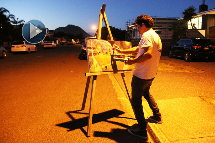 Jamie Harkins has been painting Mount Maunganui street scenes at night, with the paintings being exhibited at Float Antigravity Fitness for one night and one day... Read More