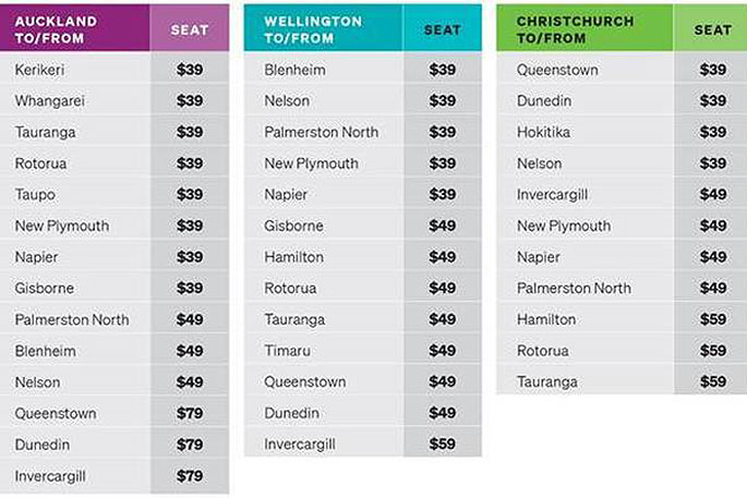 According to a schedule on Stuff today, flights to and from Auckland to the central Bay of Plenty destinations will be priced at $39, each way from Wellington, $49; and similar to and from Christchurch, $59.