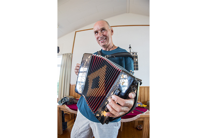 Nearly 60 people are seated at tables, a display of Dutch books is in one corner, and Henk van Zoelen wanders around playing his accordion, adding to the lively atmosphere. His wife Elly is serving delicious morsels.