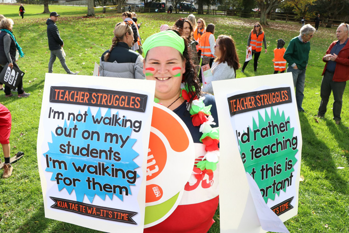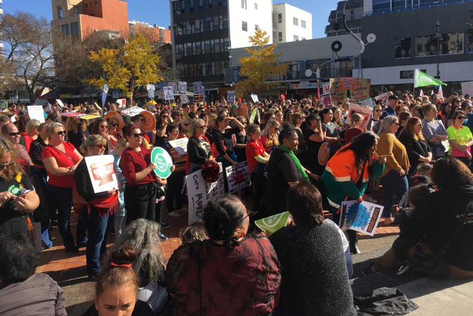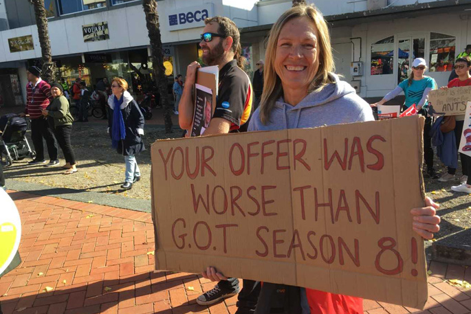 A teacher strike taking place in Hamilton, near Garden Place. Image: Claire and Brian Rogers.