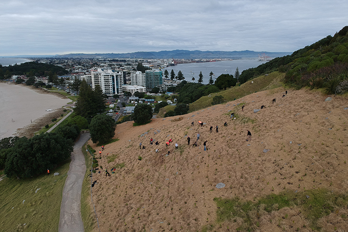 Tauranga City Council's Parks Asset Coordinator, David Grimmer drives these planting days for Mauao, and leads the way with maintenance, all part of the long term plan to restore the habitat and reduce erosion around Mauao.