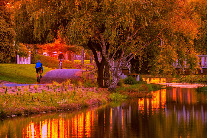 'Riding into sunset'. The Wairakei Stream stormwater catchment reserve stretches 15km through Papamoa Beach neighbourhoods creating beautiful public recreational reserve and green space. Photo: Chris Taylor Photography
