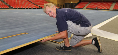 Mark Slane of Hardwood Technology installs the temporary tennis court for next week's Davis Cup competition at Tect Arena at Baypark.