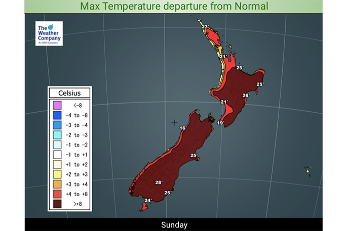 'Sunday in particular is well above normal nationwide with about 75 per cent of the country 8 degrees C or more above normal for this time of year,” says a spokesperson for WeatherWatch.