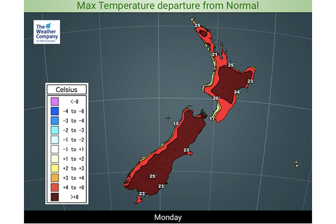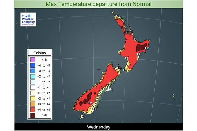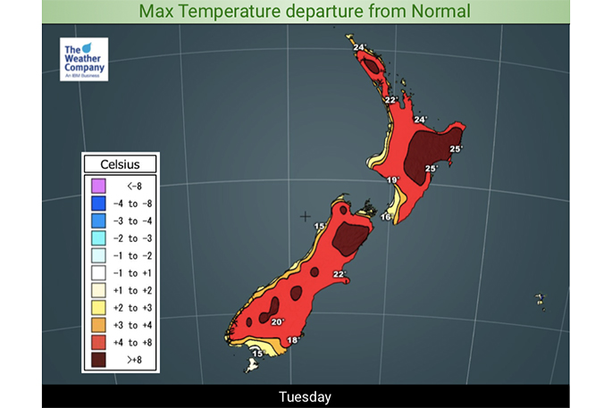 NZ's MetService defines a heatwave as five consecutive days or more with daily maximum temperatures five degrees or more above normal.