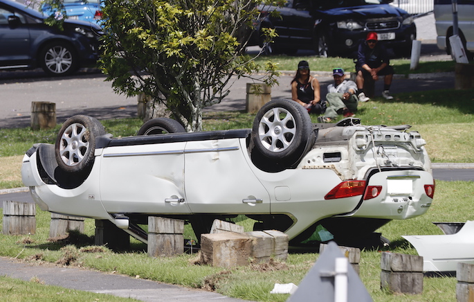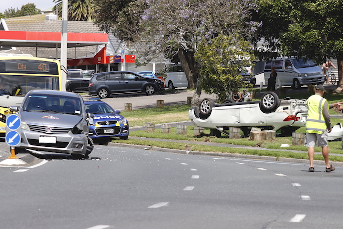 A car has crashed and flipped on Welcome Bay Road near the intersection of Waitaha Road.