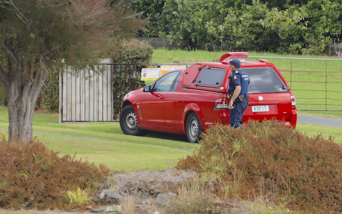 A large Police presence is in Matapihi Rd, with officers searching vehicles as they leave the area.