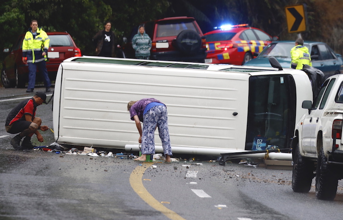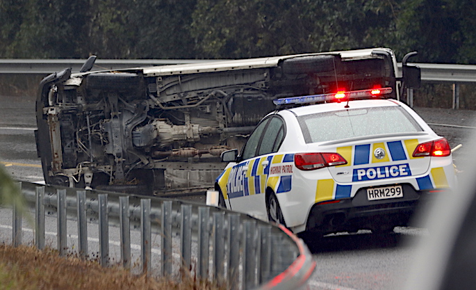 A SunLive reporter the scene says a Toyota Hiace van has rolled on its side and is blocking both southbound lanes, about 10km South of Paeangaroa.