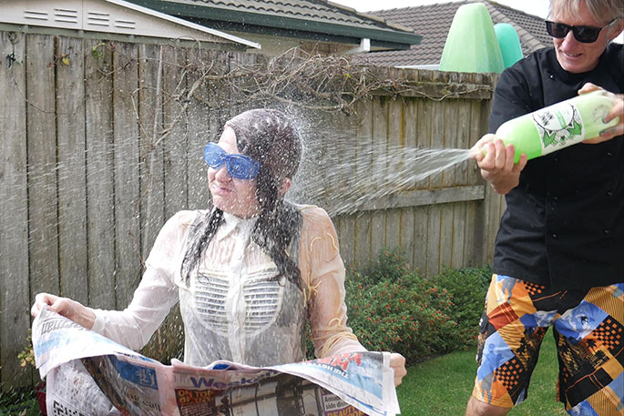 Mikkayla being covered in fizzy-drink by Craig, in a video called Kiwi Patience Test.