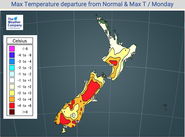 Afternoon temperatures for New Zealand on Monday shown. Image: WeatherWatch.