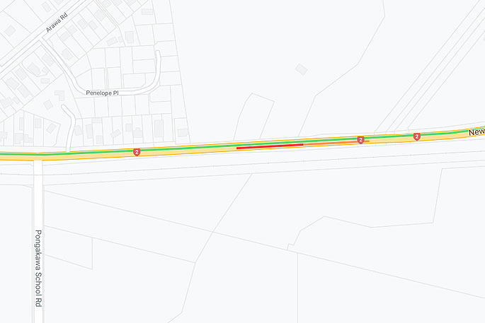 Google Maps' live traffic reporting show traffic is stopped on the highway, near Pongakawa Station Road. Image: Google Maps.