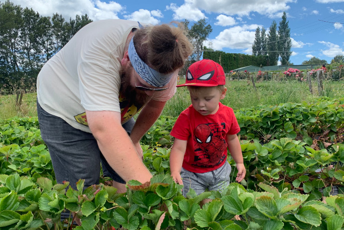 Moss Crawford-Saunders, age 3, strawberry picking at Somerfield Farm in Oropi with his father Ford Saunders.