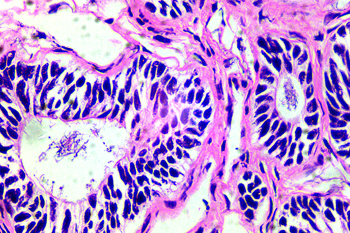 Thin sections of the gland were put on a microscope slide and stained. If sperm was present it would show up as dark blue, while the rest of the cell structure would be more purple.
