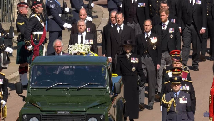 The service followed a funeral procession, in which Philip's coffin travelled to the chapel on a specially adapted Land Rover designed by Philip himself for the eight-minute journey to St George's Chapel. Philip's coffin was draped in his personal standard, and topped with his Royal Navy cap and sword and a wreath of flowers.