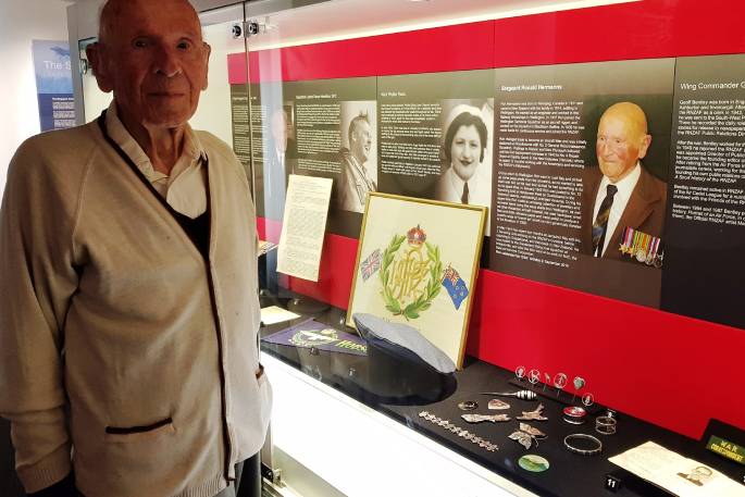 Mr Hermanns visiting the display of his ‘trench art' at the Air Force Museum of New Zealand in 2018. Image: Air Force Museum of New Zealand.