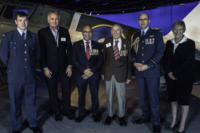 A number of invited guests and dignitaries joined Hermanns in celebrating his 108th birthday at a reception at the Air Force Museum of New Zealand in Christchurch in 2019. Pictured l-r: Aircraftman Hamish Batchelor (then youngest airman in the RNZAF), Mr Viv De Beus (General Manager – Aircraft Maintenance, Air New Zealand), Hon. Ron Mark (then Minister of Defence and Veterans' Affairs), Mr Ron Hermanns, Air Vice-Marshal Andrew Clark (Chief of Air Force), Her Worship Lianne Dalziel (Mayor of Christchurch). Image: NZDF.