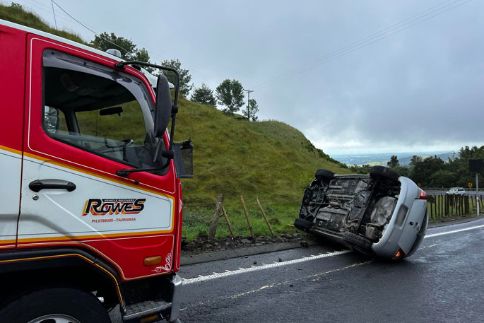 Update 9:53am: A car that has rolled on State Highway 29 near the Kaimai ranges is being moved onto a tow truck, a witness at the scene says.