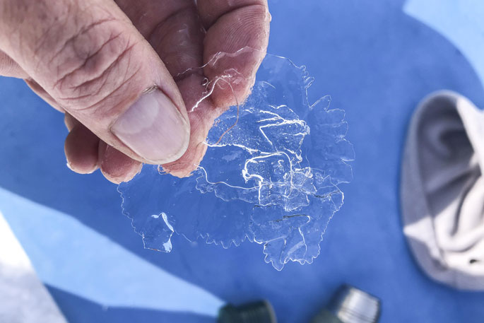 It works a bit like an apple corer, plunging into the ice without any spin, allowing platelet ice layers to be captured along with the water that fills the gaps between the ice crystals. This prevents the structure from collapsing and maintains the platelet layers, so that the algae, bacteria, and animals that are living between the platelets can collected along with their habitat.