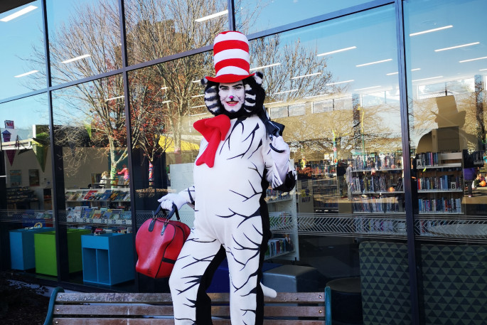 Rowan Ford Dawson as The Cat in the Hat at Greerton Library. Photo: Supplied.