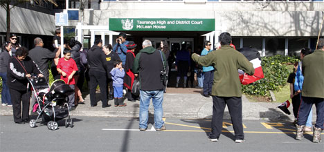 Crowds gather outside Tauranga District Court.