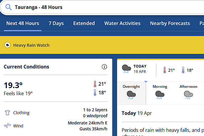 'A heavy rain warning remains in force for Northland and the Coromandel Peninsula. Heavy rain watches are in force for eastern parts of Auckland north of Orewa, Great Barrier Island and Bay of Plenty west of Tauranga.