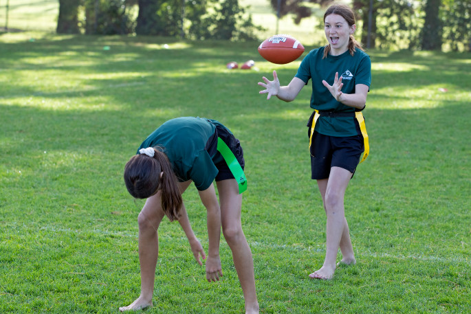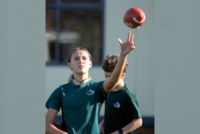 Mount Intermediate's Katia Harris of trying her hand at American Football during Graham's school visit. Photo: John Borren.