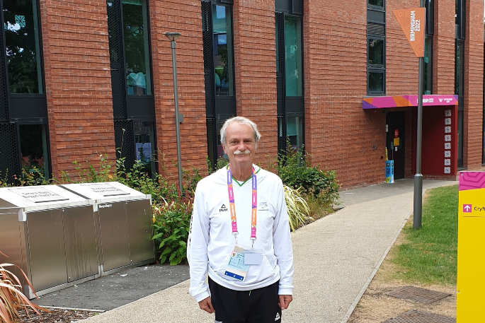Tauranga lawn bowls athlete Graham Skellern outside the athlete village at Warwick University in Birmingham. Photo: Supplied.