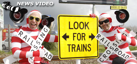 Candy striped suits with flashing lights and bells are being used to highlight Kiwi Rail's main message during Rail Safety Week - to keep people off railway tracks.