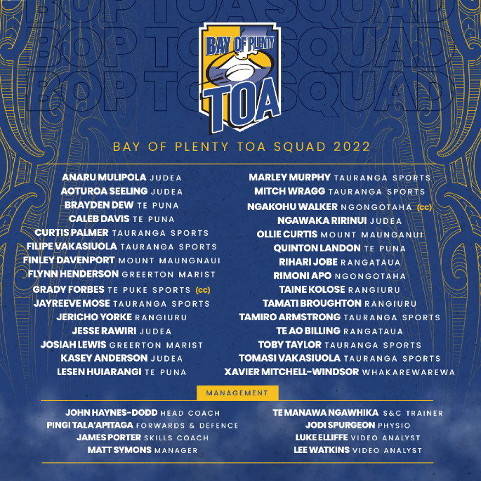 A playing 23 will be named each week for the Bay of Plenty Toa, with their first game scheduled next Saturday August 13, vs Counties Manukau Under 19s/20s.