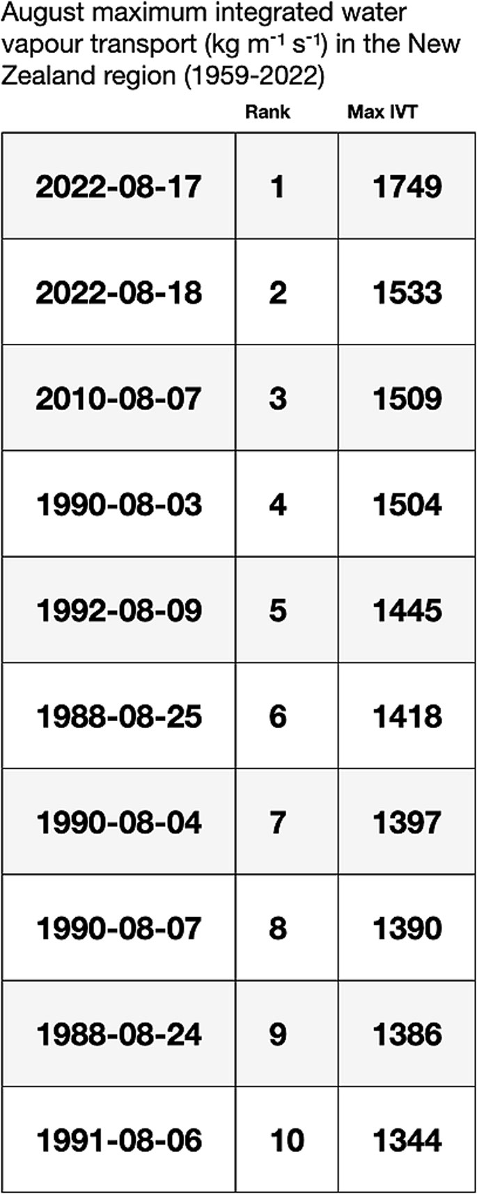 ARs are measured by integrated water vapour transport values, which have been ranked around New Zealand for every hour since 1959.