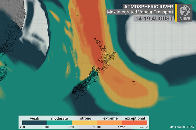 The AR, a huge plume of moisture from the tropics, was New Zealand's strongest ever for August since records began in 1959.